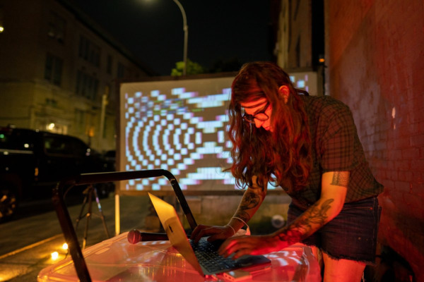 image description: Jessica is outdoors in the street, before a brick wall, standing over and typing into a laptop, performing live coding music. A microphone is next to the laptop. Jessica has long brown hair, glasses, arms covered in tattoos and cut-off jean shorts. Behind her is a screen with a black and white symmetrical moire pattern projected onto it. Yellow and red light illuminates the scene.